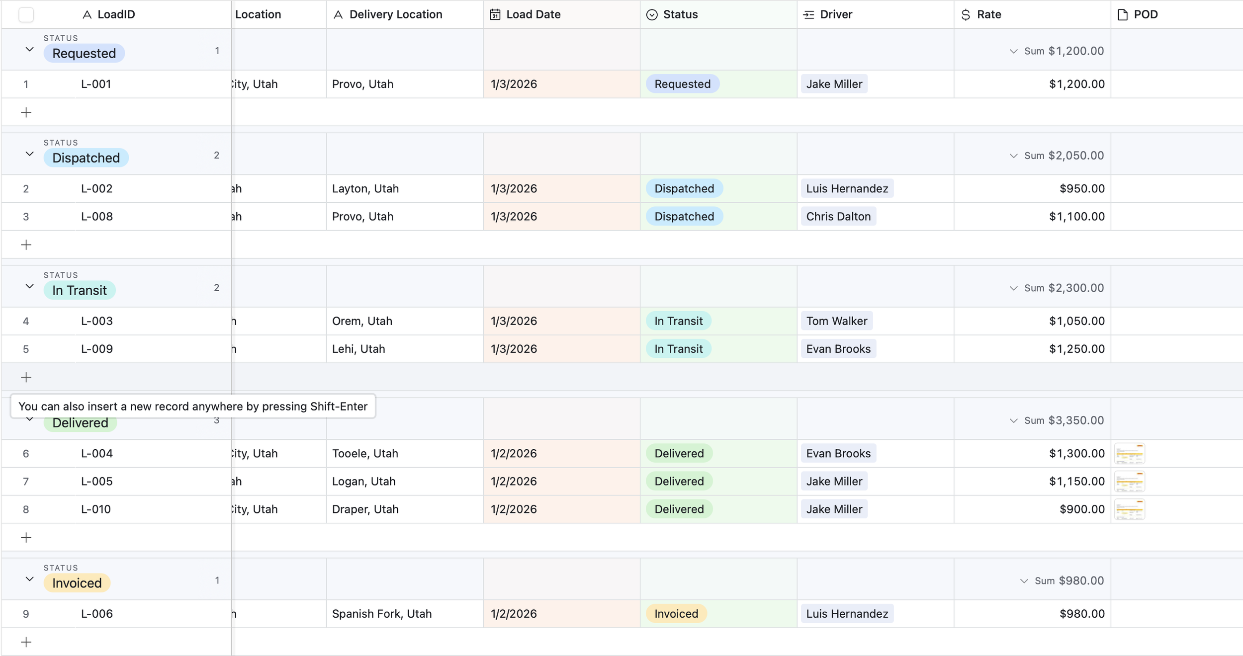 Loads table, customers, drivers, trucks.